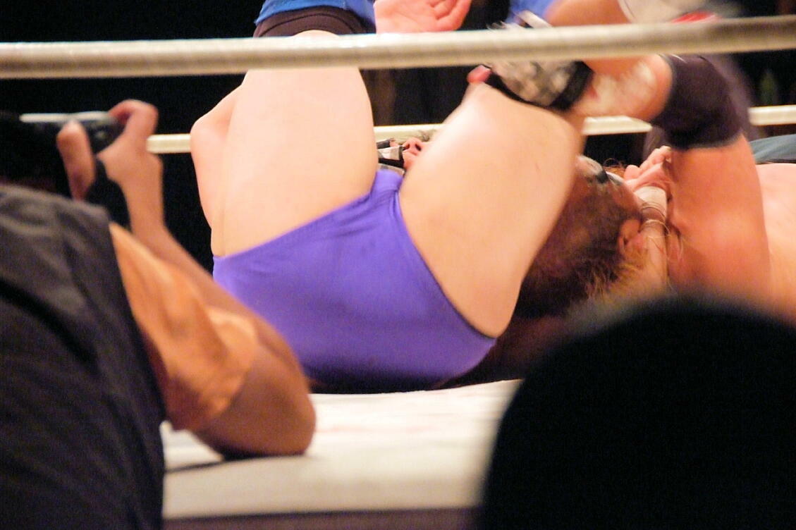 | ダイブ系の攻撃を受けてすぐさまフォールっつう感じですよね!にしても厚い胸板ですよね!うらやましいのとトレーニングの賜物って感じがして、結構いい感じですよね! |